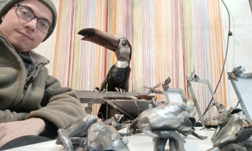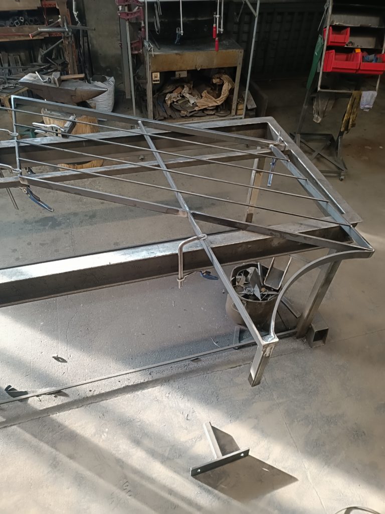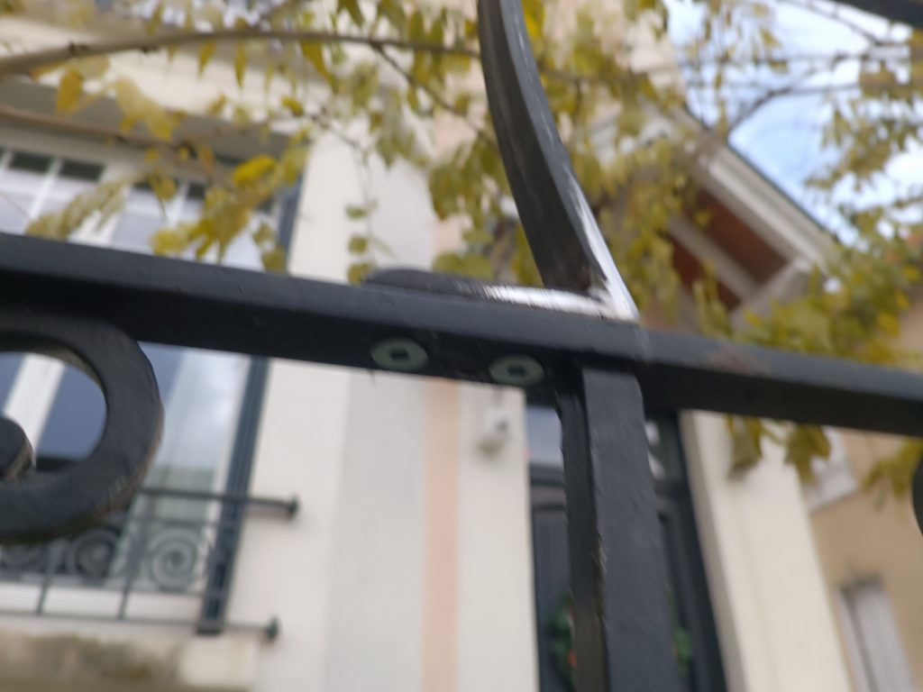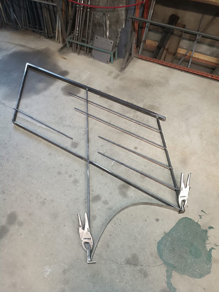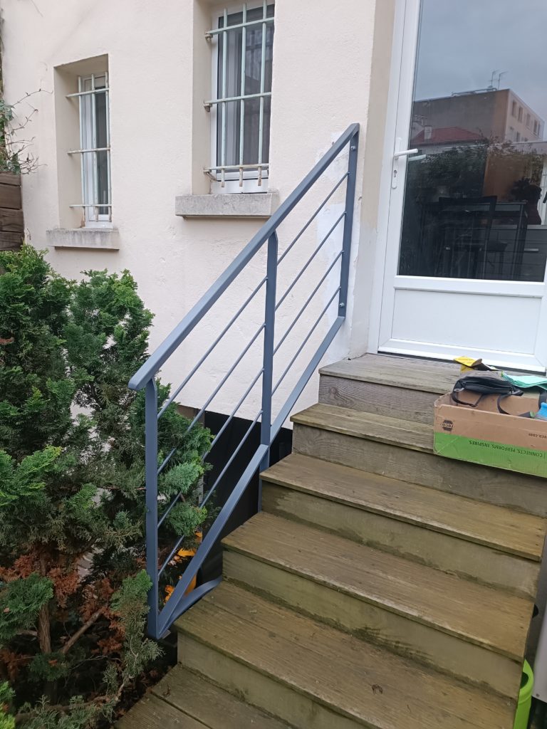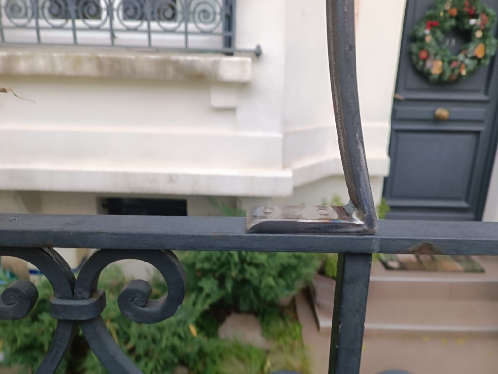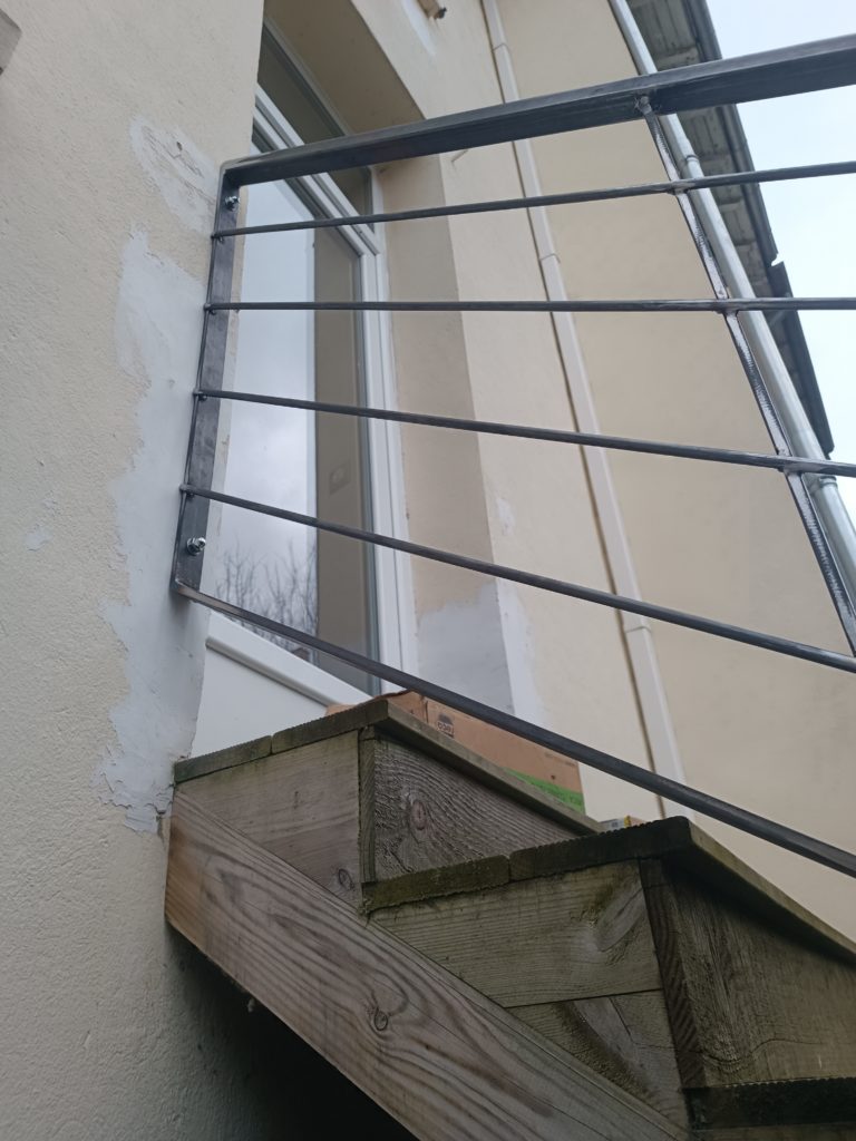 La rampe a comme contrainte de ne pas se fixer à l’escalier en planches de bois, mais à la dalle béton en dessous, moins large que les marches, et accessible que par la moitié de la montée. Le bas de la rampe a son pilier de départ qui est donc flottant, il a fallu consolider l’ensemble avec seulement les fixations murales, et un encrage de pied central. Ce qui rend ce design atypique mais en solution élégante.