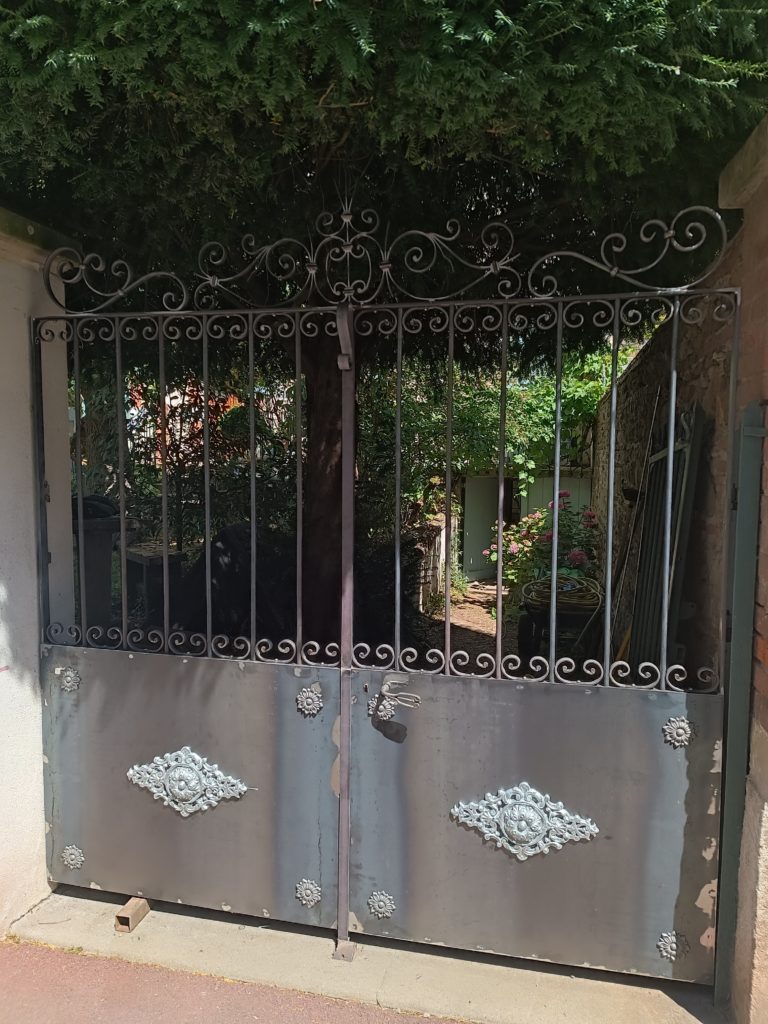 Réalisation avec volutes presque entièrement réalisées à l’atelier, les deux ensembles volutes latéraux sur les traverses hautes sont d’usine, mais toutes les autres sont fabriquées à l’atelier, un bout de fer rond soudé sur un plat pour le noyau en olive, et volutage à froid. Les barreaux sont fixés en soudures borgnes à travers les traverses, donc sans soudure visible, le top du top…