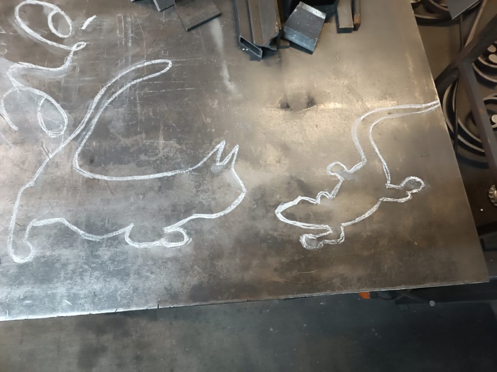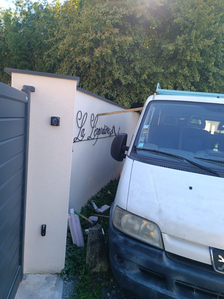 À cause des formes « fragiles » à appliquer au mur, j’ ai soudé pas mal de tiges à sceller, et comme le maintien pendant séchage (10 minutes environ) devait se faire partout en même temps, j’ ai tenu avec un appui contre mon camion à un endroit qui voulait se décoller.